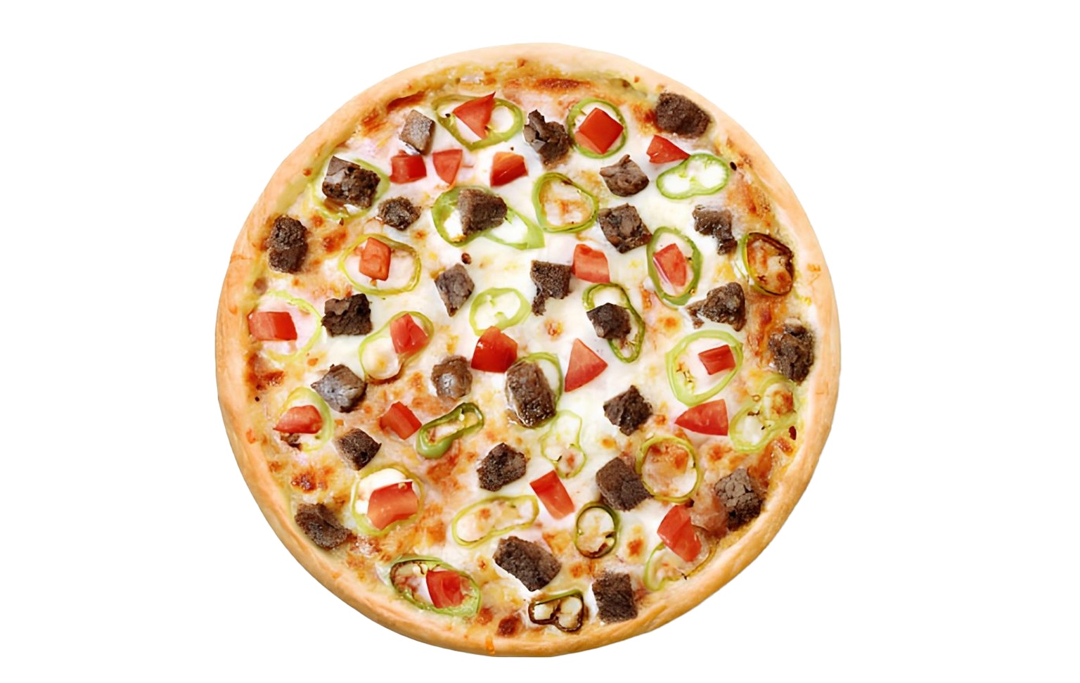 Domates Küpleri, Dana Kavurma, Köy Biberi, Mozzarella, Özel Pizza Sosu