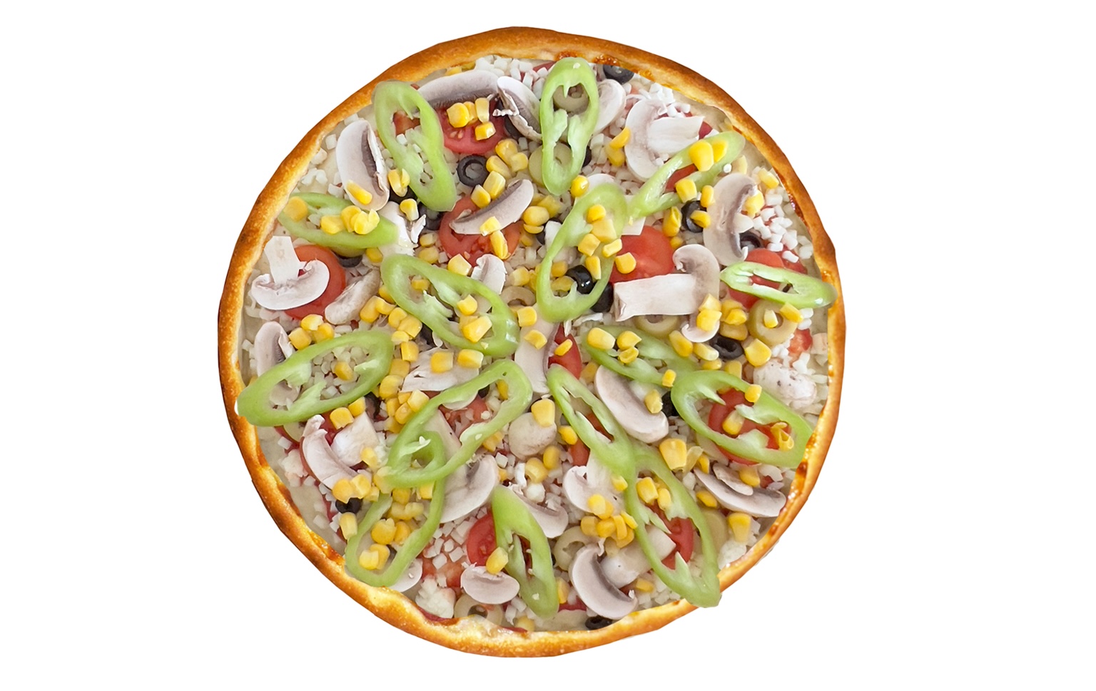 Dilimli Siyah Zeytin, Dilimli Yeşil Zeytin, Domates Küpleri, Mantar, Mısır, Köy Biberi, Mozzarella, Özel Pizza Sosu